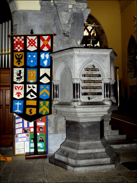 Pulpit in St. Nicholas alongside the banner of Galway Tribes. The Ffrench tribe is the 9th one.