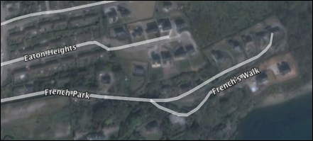 French Park is a dead end road with 7 houses. It may well be that those houses are built on land that has been sold off from what was part of the French property [3]. The port of Cobh is to the left and the area of the French home is east of, and outside, the city. Using the ŇeÓ in the word FrenchŐs Walk, the French cottage is directly under that, near the water. Directly above the ŇeÓ is a house (one of 7). That house is the house you can see at the top right of the aerial photo above this photo.