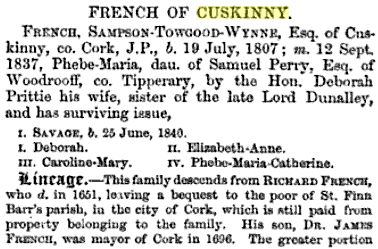 6.1* Sampson-Towgood-Wynne French, of Cuskinny, Co. Cork, J.P., b. 19 Jul 1807 in Cuskinny, Cork, Ireland, d. 12 Nov 1878 [1] [5], m. 12 Sep 1837 to Phebe-Maria Perry, youngest dau. of Samuel Perry, Esq. of Woodrooff, Co. Tipperary and his wife Hon. Deborah Prittie, sister of the late Lord Dunalley [1]. Phoebe was b. ca. 1815 in Woodruffe, Co. Tipperary [7] and d. 7 Sep 1893 [5] in Cuskinny, Cork, Ireland [7]. Sampson received his degree on 16 Jun 1859, age 18 from the University of Oxford [6]. He had issue [1]. He owned 5,310 acres in Cuskinny.