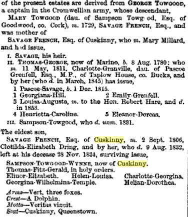The greater portion of the present estate are derived from George Towgood, a captain in the Cromwellian army, whose decendant, Mary Towgood, m. Savage French in 1729. She was the dau. of Sampson Towgood, Esq. of Goodwood, Co. Cork. [1].