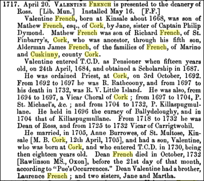 3.1* Valentine French, born at Kinsale ca. 1668, son of Matthew French, esq. of Cork. He entered T.C.D. as Pensioner when 15 years old on 24 Apr 1684, and obtained a Scholarship in 1687. He was ordained Priest, at Cork, on 3 Oct 1692. From 1692 to 1697 he was R. Rathcoony, and from 1697 to his death in 1732, was R. V. Little Island. He was also from 1694 to 1697, a Vicar Choral of Cork; from 1697 to 1704, P. St. MichaelŐs; and from 1704 to 1732, P. Killaspugmullane. He held in 1696 the curacy of Ballydeloughy, and in 1704 that of Killaspugmullane. From 1718 to 1732 he was Dean of Ross, and from 1725 to 1732 Vicar of Carrigtwohil. He m. on 12 Apr 1705 to Anne Burrowed, of St. Multose, Kinsale [15].