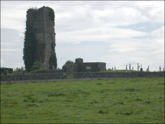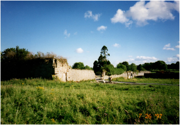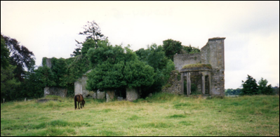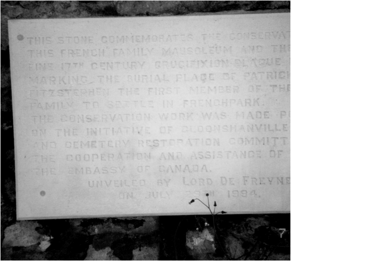 The Frenches of Frenchpark belonged to the Roman Catholic Church in the center of the village. The church is full of French plaques. Mara French photographed all the French plaques in the church in 1985. She remembers various large caskets, each about 3Õ high, covering floor space so it was difficult to walk around, and definitely there was no room for sitting. By MaraÕs second visit in 1997, all the monuments and caskets were removed and the church was turned back to the people as a congregation where services were held. Dierde OÕGara takes care of the old Church of Ireland which is now a museum to Dr. Douglas Hyde. Dierde knows everything about the French family [1]. After the church was turned over to a new priest, the old French plaques and monuments were brought back to the church. There is a graveyard at Cloonshanville, some distance from the church, where Mara French took many photos of the French clan in 1997. The Cloonshanville Abbey is along the Boyle Road; it was erected in 1385 by MacDermott Roe for the Dominicans. See Cloonshanville Priory below.