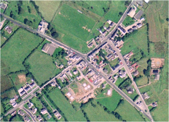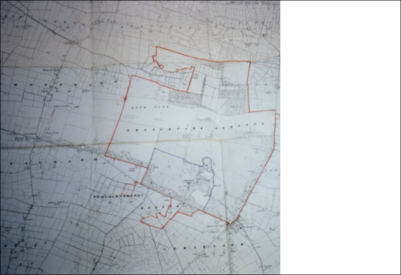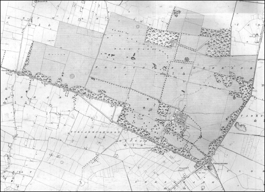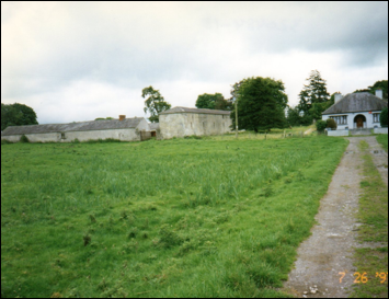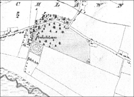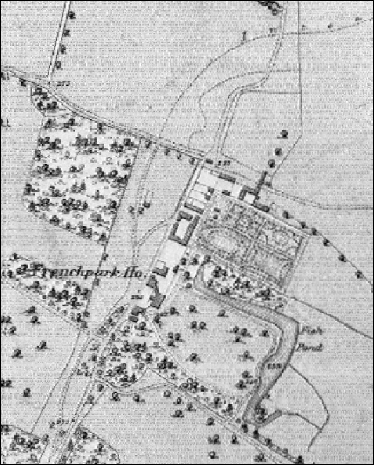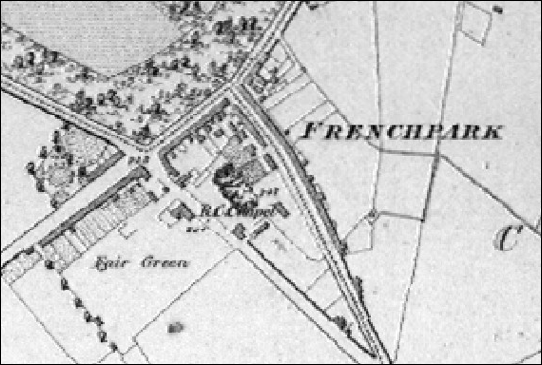 The mansion at Frenchpark is a massive structure of brick, with two projecting wings, and was the property of Arthur French, Esq.; the demesne (the lands of an estate) comprises about 1458 statute acres, finely wooded. Here is a R. C. chapel, towards the erection of which the French family contributed largely. Near it is the rent-office of Arthur French, Esq., where petty sessions were held. In the deer park of the demesne is a remarkable cave, consisting of five rooms, supposed to be druidical [4]. The Frenchpark home does not exist anymore. Only fields remain.