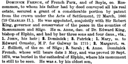 1.2* Dominick French, his fatherÕs heir, b. ca. 1628 in Frenchpark [9], made his will in Frenchpark and named the town then in May 1670 [8]. The lands in Frenchpark were given to him in 1666 and consisted of 5,000 acres. It was from his second son, Dominick, that the De Freyne family is descended [8]. He m. Anne King, daughter of John King of Boyle who was the son of Dr. Edward King, Bishop of Elphin or Elgin, ca. 1658, and d. ca. 1675 [9]. He was also of Boyle. Dominick, whose will bears the date 3 May 1670 was buried in the cathedral of Elphin, where his monument is still to be seen per Ref. [30].