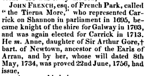 2.2* John French, DominickÕs heir [30], Tiarna Mor or the Great Landowner, b. ca. 1660, was the eldest son of Dominick who succeeded his father. John made his will in Frenchpark at an advanced age on 1734. He left a very large sum of money to be expended on his funeral; his body was laid in state in the park for three days and nights and the county were feasted round it. He m. Anne Gore [9]. She d. before 22 Jun 1756, the dau. of Sir Arthur Gore, Bart of Newtown [13] [29]. He fought in the army of King William, and commanded a trop in the Enniskillen dragoons at the battle of Aughrim, having been attainted on account of his Whig principles by the parliament held by James II at Dublin in 1690. In 1703 he acquired by purchase from the Trustees of the Forfeited Estates the greater part of the estate forfeited by Major Owen OÕConor of Ballinagar. He represented Carrick-on-Shannon in parliament in 1695 (William III), became knight of the shire for Galway in 1703, and again in 1710, and was elected for Tulsk, of which borough he was patron in 1715 and 1722. John and Anne had 8 children.