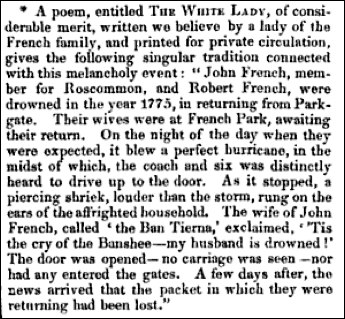 4.1 John French (Shane Dhu), his fatherÕs heir, b. 9 Nov 1723 in Frenchpark, Roscommon, Ireland [9], the next successor, M.P. for Roscommon from 1743 until his death in 1775, in which year he and his brother Robert were drowned while crossing by boat from Dublin to Parkgate, England. He was on his way to London to be called to the House of Peers as Lord Dungar [8]. He m. Alicia Crawford on 29 Mar 1759. She was b. ca. 1727 in Fermanagh, Ireland [9]. She was the dau. of Ralph Crawford of Snowhill [13] [30] in the county of Fermanagh, but had no issue, and was succeeded by his brother Arthur [30]. John FrenchÕs funeral and wake were an extravaganza - his body lay in state in the park for three days and nights while the county was feasted around it. Obviously there were several spates of building at Frenchpark, and inasmuch as the linked pavilions and some of the other buildings definitely appear to be the work of Richard Castle, it is reasonable to conclude that his son, Arthur French, with his new inheritance, employed Richard Castle to renovate and add to the old mansion. He was M.P. for Roscommon from 1743 until his death in 1775, in which year he and his brother Robert were drowned while crossing by boat to England. He was on his way to London to be called to the House of Peers as Lord Dungal [8].