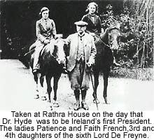 Their son Douglas Hyde, b. 17 Jan 1860, was IrelandÕs first President. Lord de FreyneÕs brother, John French, gave his Roscommon estate, Ratra, in 1893 to Dr. Douglas Hyde. Ratra was located 2 miles from the center of the village of Frenchpark, but has been since demolished.