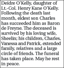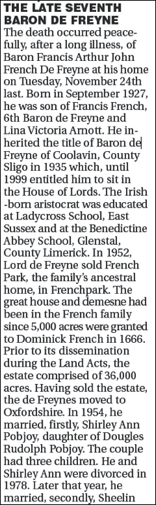 9.13* Francis Arthur John French, 7th Baron de Freyne of Coolavin, b. 3 Sep 1927 in Dublin, Ireland, d. 24 Nov 2009, and was the Lord De Freyne up until his death. He m1. Shirley Ann Pobjov [9], dau. of Dougles Rudolph Pobjoy on 30 Jan 1954 [7]. As a result of her marriage, Shirley Ann Pobjoy was styled as Baroness de Freyne of Coolavin on 30 Jan 1954. Francis and Shirley divorced in 1978 [7]. He m2. Sheelin Deidre OÕKelly, dau. of Lt. Col. Henry Kane OÕKelly on 18 Jul 1978, the widow of W. W. Stevenson who died 13 years prior [1]. The Heir Apparent is the present holder's son Hon. Fulke Charles Arthur John French. Francis celebrated his 80th birthday in the summer of 2007 in London; everyone there was a direct descendant of his grandparents. Francis says his family had been in Galway before Frenchpark, and before Galway they were in Herefordshire, England. He emigrated to England when the Land Commission took over the last of their estate. He last resided in Oxfordshire, England and was a prominent member of the House of Lords and has 3 children. The following article is from the Roscommon Herald, p. 38, in the Local Notes section, dated Tuesday, December 8, 2009.
