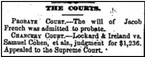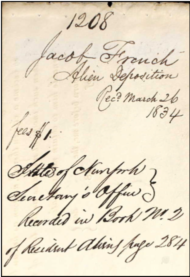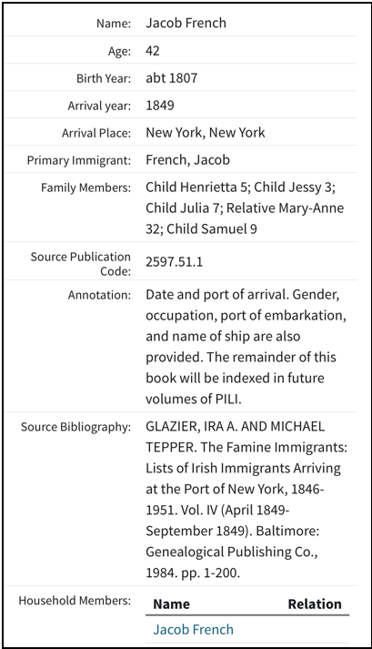 Jacob’s father presumedly lived with Jacob in New York and would appear in the 1820 or 1830 census. Researching these documents one by one, 12 families with the surname French appear in the 1820 Census of New York, New York, but none of them have names given to Jacob’s family in later generations. Plus, Jacob may have immigrated shortly after the 1820 census was taken and his name would have not been included. The heads of households of those families in 1820 are: