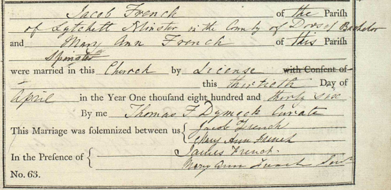Jacob married Mary Ann French in Dorset in 1836 (earliest known date and place for Jacob) who had the same surname, but was unrelated. Her parents were Samuel French and Mary Palmer. Jacob’s parents are yet unknown, but the following documentation gives a few possible answers.
