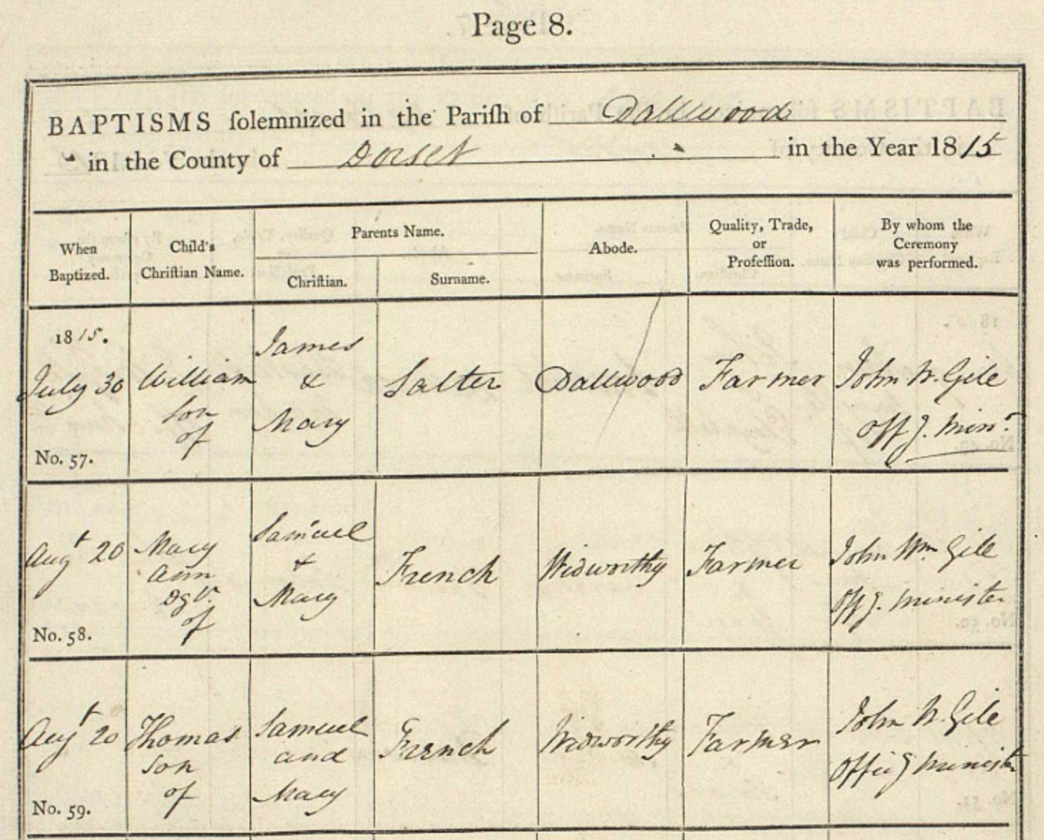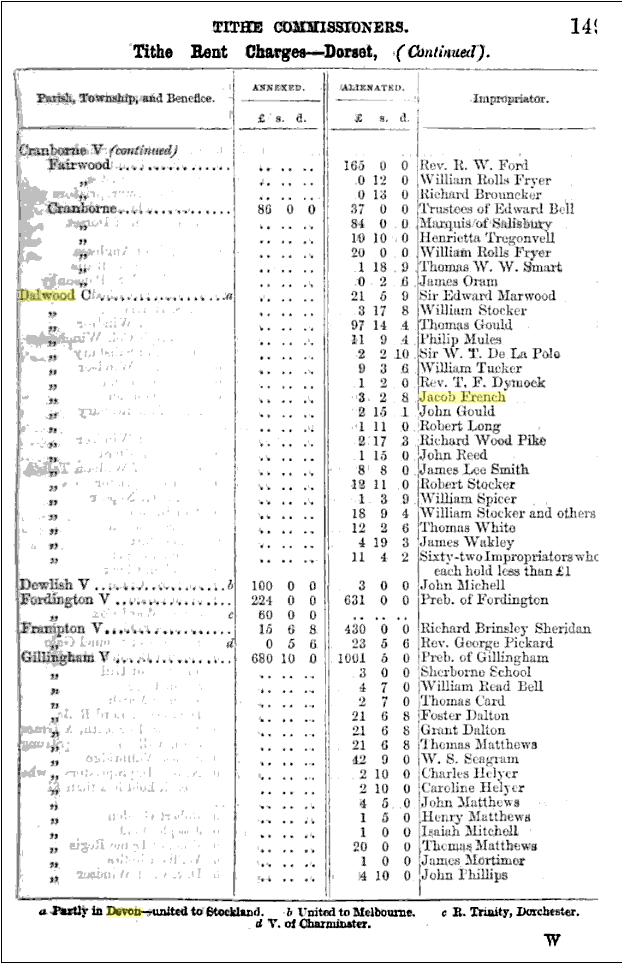 The earliest records of this family are from Stockland, Fordington Liberty, Dorset, England, in 1834 even though Jacob French, Jesse’s father, was born in ca. 1807 but not in Dorset. A Liberty was an administrative unit of local government in England from the Middle Ages to the 19th century, co-existing with the then operative system of Hundreds and Boroughs but independent of both, generally for reasons of tenure. Refer to List of Liberties in Dorset. The St. Peter’s Church Dalwood Records of Baptisms, Marriages, and Burials start in the year 1568 and continue to the present day. Unfortunately, the second Register Book from 1655 to 1713 is missing. Jacob French lived later on in Dorset, but he was not born there.