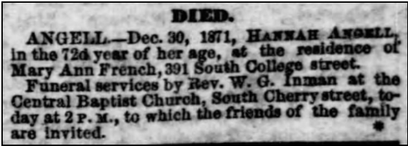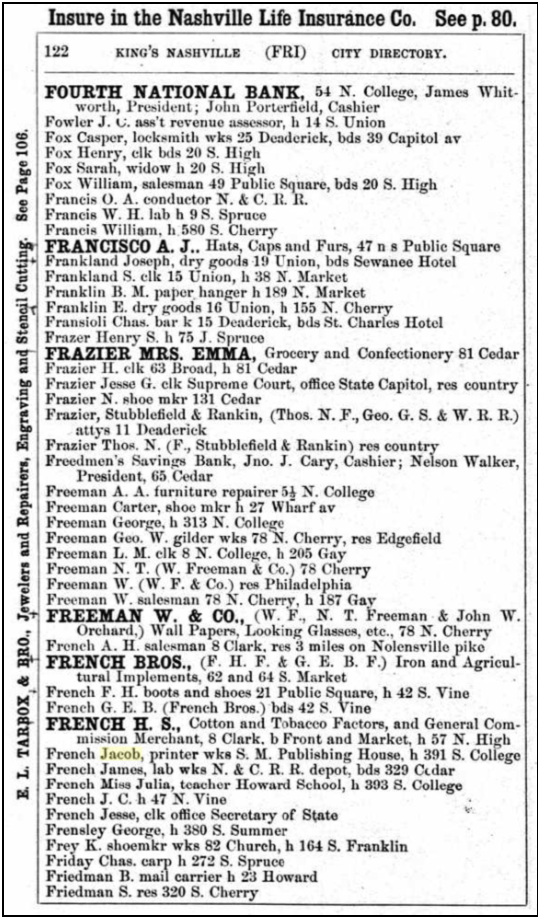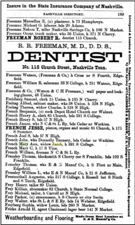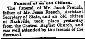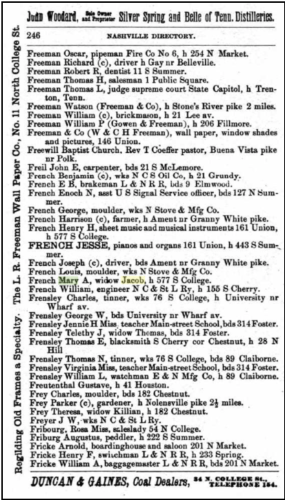 1871 in Nashville, TN, m. Mary Ann French, b. 1814, d. before 1910.