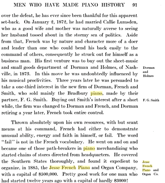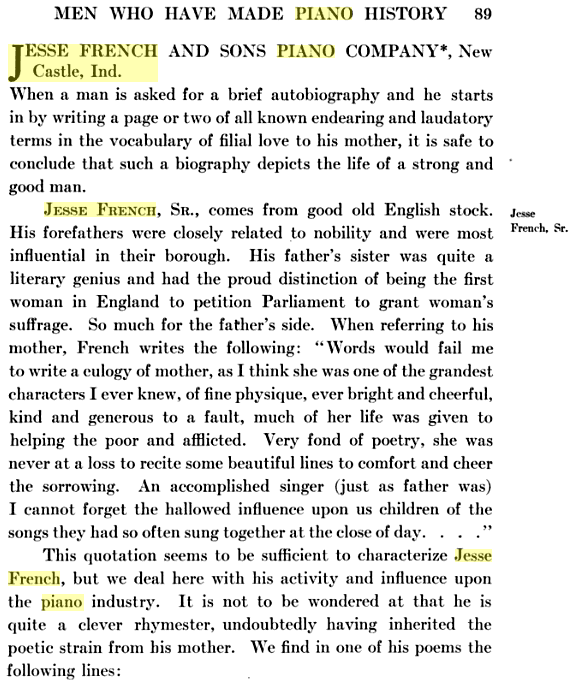 Jacob “supposedly” had a sister who was quite a literary genius and had the proud distinction of being the first woman in England to petition Parliament to grant woman’s suffrage, a movement to fight for women’s right to vote. Charlotte French was a suffragette in England and originally from Kent, and before that, her family was from Ireland. Age-wise, she does not appear to be of Jacob’s generation, but from the generation of his son, Jesse. This information is presented in a section of the book “Men Who Have Made Piano History” written by Alfred Dolge, Volume I, 1911, as seen on books.google.com. At this time, Jesse French was 65 years of age. Volume II was written by the same author in 1913. This information might lead to Jacob’s father as the rest of this article is quite accurate.