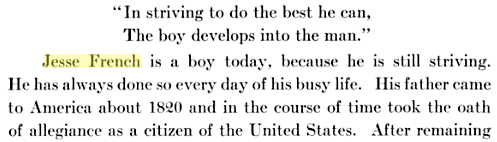 Jesse French in 1896 Original research by Mara French. Revision 1 in 2009, Revision 2 on 8/15/12. Last updated on 6/9/19. An asterisk (*) shows continuation of that line. Square brackets [ ] indicate reference to the Bibliography. Genealogical research is always a “work-in-progress” and can be improved by your corrections or additions to Mara French. |