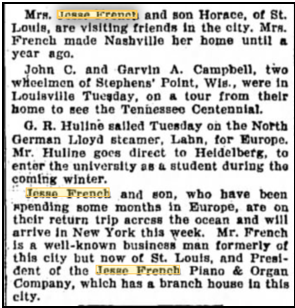 4. Donna Kennedy Nichols, email: 3dknichols8@tampabay.rr.com or grannygrey50@hotmail.com or 3dnichols8@earthlink.net. I know Jesse French of Jesse French and Sons Pianos. His son, Jesse French Jr, married my grandfather's sister, Edith Kennedy (she was known as Nell). My Aunt Nell and Uncle Jesse lived in Ocala and I spent much time with them when I was a child, and knew their grandchildren. Part of the year they were in New Castle, IN, and were either with Horace and Mable French or at our house. My grandfather, Aunt Nellie's brother, was Dr. Walter Urban Kennedy. They were born in Murrayville, IL. They also had a brother, John, who lived in California. In fact, he was in CA when their mother Kathleen Steuart died in Winchester. Helen Kennedy, born in IL in 1880's, married Jesse French, probably from New Castle, IN. They owned Jesse French and Sons Piano Factory. One of Uncle Jesse's brothers was Horace French who lived in New Castle. Uncle Jesse and Aunt Nell had at least 2 children - John French who did live in Tallahassee, FL and Caroline who married Richard Banta of Crawfordsville, IN. Jesse and Nell French lived in Ocala, Florida for many years. I have recently found some things belonging to my cousin Betty French Kelly, daughter of Horace, that I would like to give to a member of her family. It is a lace handkerchief she carried at her wedding in 1934. Her oldest son was Arthur French Kelly, born abt. 1940. My Uncle Jesse and Aunt Nelle lived in Ocala for their permanent home, but he was the son of Jesse French Sr. who began the company. Am trying to locate family members of Jesse French family. Uncle Jesse was of the Jesse French and Son's Piano Company. He lived part of the year in Ocala, FL with my aunt, Helen Kennedy French. Rest of the year they traveled. He died in Canada before 1952. Aunt Nellie (Helen's nickname) carried his ashes back to New Castle, IN in her purse in an urn. where he is buried in a family plot. One son was John who lived in Tallahassee, FL. He had 2 sons. They also had a daughter, Caroline, who married Richard Banta, author of The Ohio, in the River’s of America series. They lived in Crawfordsville, IN. Uncle Jesse also had brothers Horace and Edgar French who lived in New Castle, IN, and also a sister. I moved in 2001 and lost one contact of someone who sent me information on Jesse French and Son’s Pianos which was founded in either Birmingham or Nashville.