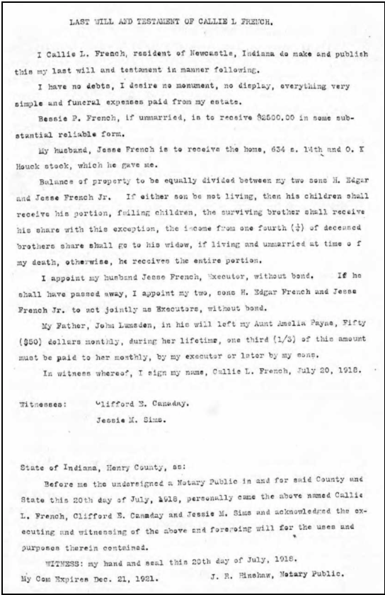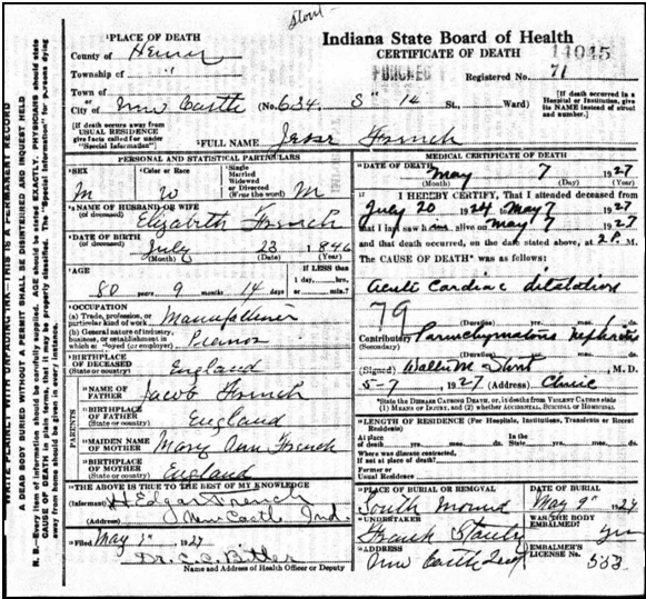 “Oh look. There’s a Krell-French piano.” The words were said not by a music teacher or an antique dealer. They were said on the big screen, by legendary actor Paul Newman in one of his films with Joanne Woodward. In the early 1900s everyone had heard of a Krell-French piano. A 1910 publication of the Industrial Edition said the piano company had become one of the largest distributors of pianos and organs, “covering an area twice as large the German empire.” The story of the piano factory in New Castle plays like a Beethoven number, a stirring rendition of community spirit and successful risk-taking, one that served as a prelude to an industrial prowess that helped make New Castle the place to be at the turn of the 20th century. Interestingly, like the Hoosier Kitchen Cabinet factory that would come later, it all started with a fire. When a fire destroyed the Krell-French Piano Factory in Springfield, Tenn., New Castle city leaders – led by Charles Hernly, a true economic developer long before the term ever came into existence – decided to lure the company here. But it took $60,000 in cash and another $125,000 for preferred stock. As well as an equally large leap in faith. “The directors were neither stampeded nor frightened at the size of the deal,” an article in the 1903 New Castle Democrat reported. “Calling in a few good citizens, they arranged to meet the piano company directors at Indianapolis on a certain day. Before that meeting was over, these eight or 10 men had signed a contract making themselves individually responsible for payment of the money.” It might have been perceived as a gamble at the time. But the end result produced a veritable symphony of noteworthy benefits for the town. The Krell-French Piano Company would become one of the four largest in the United States. The plant itself contained over five acres of floor space and employed more than 400 skilled workers. Thousands of pianos were kept moving through the factory at all times in various stages of construction. An average weekly payroll of $4,500 was realized here, translating to an annual payroll of $250,000. To say the piano factory success was one of the keys to New Castle’s early growth is an understatement. The population increased by as many as 3,000 people – more than had come to town in the previous half-century. The ripple effects of the piano factory led to other monumental events in New Castle’s history. Jesse French Sr., who bought out his partner and made it the Jesse French Piano Factory, contributed $45,000 to construction of a new YMCA on Church Street, a facility that served New Castle for more than 70 years. In 1989, the Henry County Historical Society museum had a unique visitor. Elizabeth French Kelly, the daughter of Jesse French Jr. and granddaughter of company co-founder Jesse French Sr., visited the facility and spent some time around the vintage Jesse French piano featured in the museum’s main room. Her son, Dr. Steve Kelly, had arranged the trip. Dr. Kelly said then that even though the pianos aren’t made anymore, they live on like a classic song. He told the story of a patient who, in casual conversation, talked about buying an old piano on the eBay website. When asked where the piano originated, the patient said, “You wouldn’t know, some little town in Indiana.” Even more interested now, Kelly persisted, asking what brand it was. “A Jesse French piano,” was the reply. “Why, that’s my grandfather,” Kelly said. You can see an original Jesse French piano and learn more about its history at the Henry County Historical Society Museum, 606 S. 14th St. It’s open from 1 to 4:30 Wednesdays through Saturdays or by appointment, 765-529-4028. 23. Jacob French’s wife, Mary Ann French, who had the same surname as Jacob, was the daughter of Samuel French, b. ca. 1780 in England, who married Mary Palmer on 11 Mar 1806 at St. Peter’s Church in Dalwood, Dorset, England. Mary was born in 1786. See website http://www.dalwoodhistory.co.uk/resources/Marriages+1716-1912.pdf. Samuel and Mary French’s children: James, Samuel,