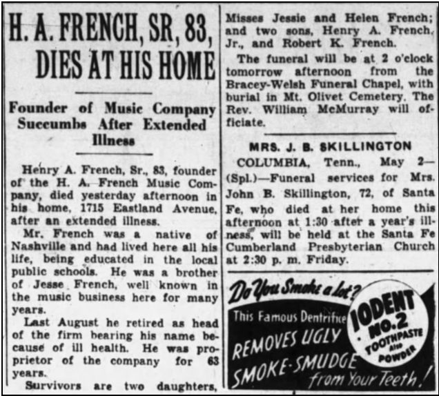 Henry A. French Sr.’s son, Henry A. French Jr., had moved to Atlanta, De Kalb Co., Georgia, age 29, b. ca. 1891 in TN, m. Julia M. and had a young son, Henry A. French III, age 1, born in 1919 in Georgia. Henry Jr. was a manager of a music store.