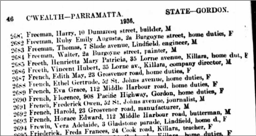 Apparently the “F” in F. Owen French stands for Frederick Owen French who was living in 1936 in Gordon, Parramatta, New South Wales (NSW), Australia, see Australian Electoral Rolls of 1936 below: