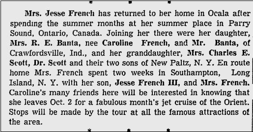4.3* Jesse Lumsden French, Jr., b. 29 Jan 1879 in TN, d. 5 Aug 1958 in Canada, m. Edith Kennedy, known as Helen “Nellie” Kennedy, or just simply “Nell”. They lived in Ocala. In 1900, Jesse L. French was 21, living in St. Louis Ward 25, St. Louis (Independent City), MO, with his parents, Jesse and Callie. In 1910 Jesse was 31, living with his wife Helen in New Castle Ward 5, Henry Co., IN, and their children: Caroline (age 6, born in MO), Jesse III (age 3, born in IL), Waller (age 2, born in IN). In 1920 Jessie was 40, living in New Castle Ward 5, Henry Co., IN, with his wife Helen, and their children Carolina (15), Jesse III (13), Walter (11), and John (3, born in IN). In 1930, Jesse Jr. is 51, living with his wife Helen (age 47, born in IL) and their son John (age 13, born in IN). Jesse Jr. was the V. P. of a Piano Factory. John, who was b. 19 Oct 1916 in New Castle, Indiana, d. in 1962 in Tallahassee, FL.