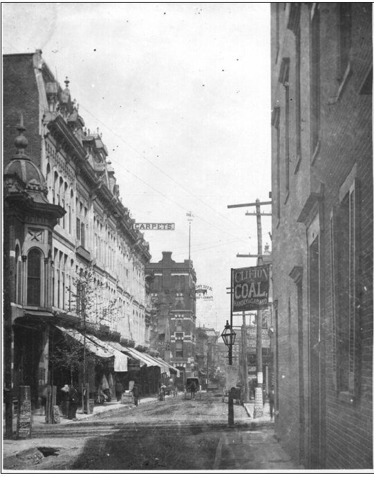 Union Street from 5th Avenue in Nashville, TN, view to the east, showing the D. Loveman Co., Jesse French Piano and Organ Store, and Clifton Coal. The Cole Building is located on the corner of 4th Avenue. Photo dated ca. 1879.