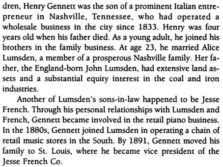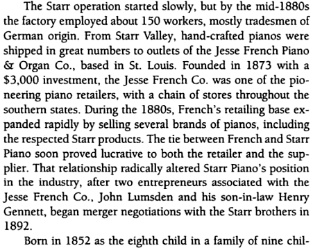 Another good book about the piano and family connections between French, Starr, Lumsden, and Gennett is “A Music Dynasty in Victorian Indiana -- Jelly Roll, Box, and Hoagy” by Rick Kennedy which can be found on Google books in its entirety. It tells a lot about the character and interactions between these 4 families. Part of it follows: