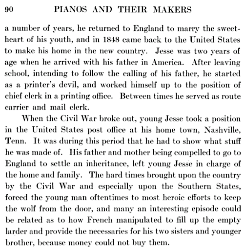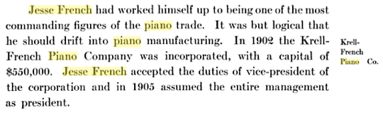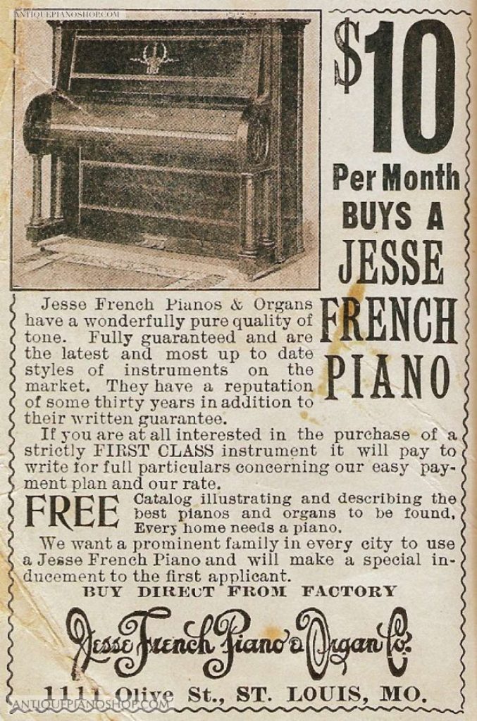 “Mr. Jesse French, the president of the company, started in the music business in 1872, branching out into the piano business in 1875, and has been continuously connected with the industry ever since. Mr. French was the founder of one, and intimately associated with others of the best known and most successful factories and distributing companies in the United States. It has always been the aim of the company to make the Jesse French & Sons instruments the very best that they could produce, regardless of expense. The Jesse French & Sons' piano is an artistic production, the culmination of years of experience in the music trade.”