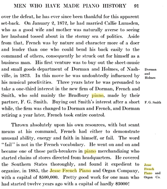 French started his company in Nashville and was soon successful. In 1883, he entered business in St. Louis with his brother-in-law, Oscar Addison Field, first as Field, French, and Company, then as the Field-French Piano Company. Field was born in New York State in 1847, entered the piano business in Nashville in 1875 (probably with French), married John Lumsden's daughter Maria in 1882, and moved to St. Louis in 1883. Under the leadership of Field, French, and Lumsden, the Field-French Piano Company was incorporated in 1887 as The Jesse French Piano and Organ Company of St. Louis. Lumsden, who had been in partnership with French and Field separately and collectively, also moved to St. Louis in 1888.