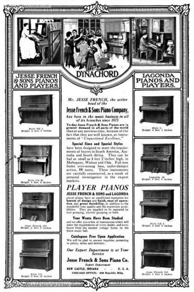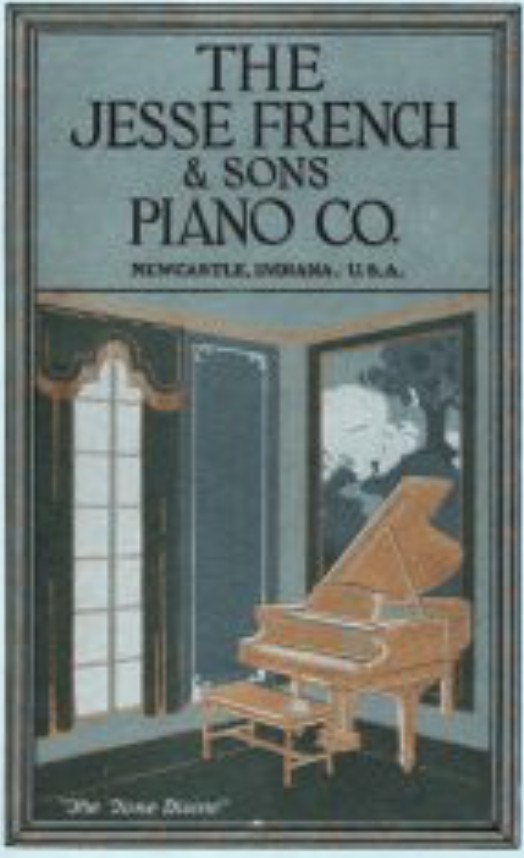 First pianos were made in Nashville, TN, under the name of Dorman French & Smith, later New Castle Indiana, formerly a division of H.A. Selmer, also affiliated with Krell French. Since 1875 the name Jesse French have stood for everything high grade in the music line. Many thousands of pianos' bearing the name Jesse French have been marketed in past years, but now these instruments bear the name of Jesse French & Sons. They are manufactured by the Jesse French & Sons Piano Co., New Castle. Ind.