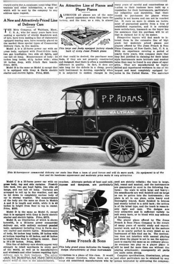 “They are made in grands, uprights, foot-power and electric players and reproducing pianos in great varieties of size and styles, and in all of the fancy woods. Every part of the instrument, with the exception of the hardware, is produced in the mammoth factory in New Castle, Ind., erected especially for the purpose and equipped with the idea of securing the best possible results in every department in every way connected with the production of Jesse French & Sons pianos. For in them, the question of quality is paramount and the desire to excel a very potent force. Two expressive mottos are well known in this connection, viz.: ‘Quality First and First Quality’ and ‘A Name well-known Since 1875'.”
