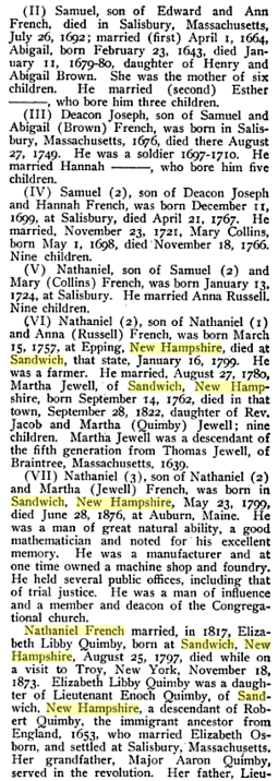 This line continues with Edward FrenchÕs 3rd son, Samuel. Harry Dana French did tremendous research on this line before he died in 1960. Roland Rhoades of the FFA paid to have all HarryÕs work copied which was in 7 huge boxes in the basement of the Concord, New Hampshire library. Roland sent these pages to Art Westneat, also of the FFA, who entered all the data into a database in early computer days, about 1985. He wrote a program in the BASIC language that sorted and printed the data line by line.