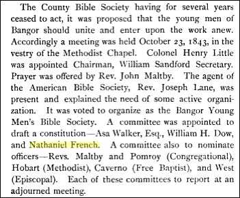 (Because Nathaniel G. French mentions he moved from NH, his native town, to Bangor, ME in 1826, it is assumed that James C. French was born in Bangor, Penobscot Co., ME. Nathaniel d. 28 Jun 1876 in Auburn, Androscoggin Co., ME, and was buried at the Mount Hope Cemetery in Bangor, Penobscot County, ME. He was born in 1829 in ME and was living in Lewiston, Lincoln Co., ME in the 1850 census. He could have been James C. FrenchÕs brother. Nathaniel was living in the 1860 census in Norway, Oxford Co., ME, married to Mary L., and had son Augustus F. French in 1859.)