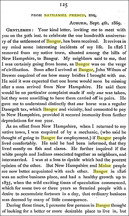 Gentlemen : Your kind letter, inviting me to meet with you on the 30th Inst, to celebrate the one hundredth anniversary of the settlement of Bangor, has been received. It revives in my mind some interesting incidents of my life. In 1826 I removed from my native town, situated among the hills of New Hampshire, to Bangor. My neighbors said to me, that I was certainly going from home, as Bangor was on the verge of civilization. Soon after I arrived at Bangor, John Wilson of Brewer enquired of me how many bridles I brought with me. He said it was expected that one horse would soon be missing after a man arrived from New Hampshire. He said there would be no particular complaint made if only one was taken, but they were unwilling to have them carried off in pairs. He gave me to understand distinctly that one horse was a regular Danegelt tax, which Bangor and vicinity, had consented to pay to New Hampshire, provided it secured immunity from further depredations for one year.