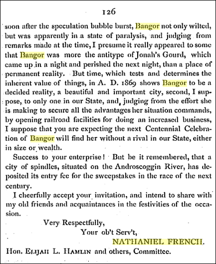 During those times, I presume few persons in Bangor thought of looking for a better or more desirable place to live in, but soon after the speculation bubble burst, Bangor not only wilted, but was apparently in a state of paralysis, and judging from remarks made at the time, I presume it really appeared to some that Bangor was more the antitype of Jonah's Gourd, which came up in a night and perished the next night, than a place of permanent reality. But time, which tests and determines the inherent reality of things, in A. D. 1869 shows Bangor to be a decided reality, a beautiful and important city, second, I suppose, to only one in our State, and judging from the effort she is making to secure all the advantages her situation commands, by opening railroad facilities for doing an increased business, I suppose that you are expecting the next Centennial Celebration of Bangor will find her without a rival in our State, either in size or wealth.