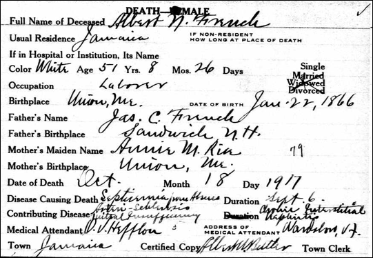 [29] Thomas Allen French, b. 10 Jan 1838 in New Sharon, Franklin Co., ME, d. 20 Sep 1920 in Chicago, Cook Co., IL, and buried at Rosehill Cemetery. He was a retired furniture or furnace salesman, living at 1123 N. Dearborn St. in Chicago, the son of Joseph French and Mary (Polly) Robinson, both born in Maine.