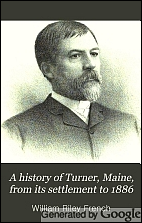 [32] A History of Turner, Maine, from its Settlement to 1886, by W. R. French (William Riley French). He was a reverend for 17 years. Website: http://www.worldcat.org/title/history-of-turner-maine-from-its-settlement-to-1886/oclc/698035/viewport. Daniel French removed from Taunton, MA (FFA Chart #3) to Turner, ME, in 1781. His wife was Sarah Sumner of Taunton. His children were Sally, who married Chandler Bradford; Daniel, who married Marion True; Philena, who married William Hayford, November 24th, 1785; Polly, who married John Pumpedlly or Pumpilly, September 11, 1788; Waitsill L., who married Anson Soule, January 21st 1792; and George, who married Wealthy Johnson, February 18th, 1799. Mrs. Sarah French died in Taunton, April 7th, 1776, after which he married the widow Sarah Turner in Turner, February 20th, 1788, by whom he had three sons, Riley who died in childhood; Charles who married Nancy Caswell, and after her death, Hannah Caswell; and Henry, who married Delana Leavitt. Daniel French died in 1813, and his widow in Jun 1845 at the age of 98 years. Daniel French was the first tanner in town.Other Frenches mentioned in this book: Phinela French, William H. French, Cyrus French who owned a saw mill, George French, John French, Edwin S. French, Hartwell S. French. This family is from FFA Chart #3; no James C. French was found in this book, dated 1886.