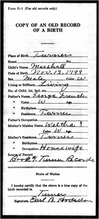 Marshal French, b. 13 Nov 1799 in Turner, Androscoggin Co., ME. His parents were George French and Wealthy French. He appears in the 1850 census of Lewiston, Lincoln Co., ME, the father of George Marshal French. He was in the clothing business ca. 1850 in Auburn, Androscoggin Co., ME. In the 1860 census of Lewiston, Androscoggin Co., ME, Marshal was 60 and living with the Clark family, in specific, Clara Elizabeth Clark who m. George A. Clark and was MarshalÕs daughter, b. 1832 in ME. In the 1850 census of Lewiston, Lincoln Co., ME, Clara E. French is 18 and living with her father, Marshal, age 50, who was probably widowed. Also living with Clara is George M. French, age 21, b. 1829 in ME; Harriet A. French, age 16, b. 1834 in ME; and Ellen J. French, age 16, b. 1834 in ME. In 1863, 1865 and 1866, Marshal was an Alderman of Lewiston, ME. In the 1870 census of Portland, Cumberland Co., ME, Marshall is living with the Clark family, and some other lodgers. Marshall died in Portland, Cumberland Co., ME, on 30 Jan 1877. This line is definitely part of FFA Chart #3.
