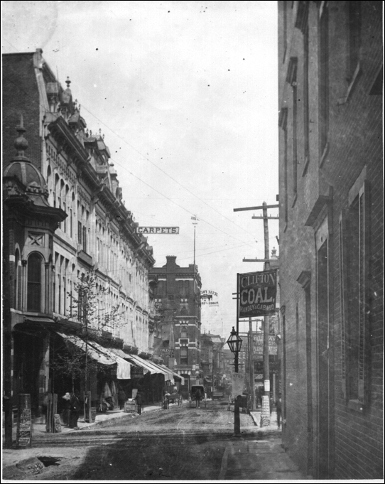Union Street from 5th Avenue in Nashville, TN, view to the east, showing the D. Loveman Co., Jesse French Piano and Organ Store, and Clifton Coal. The Cole Building is located on the corner of 4th Avenue. Photo dated ca. 1879.