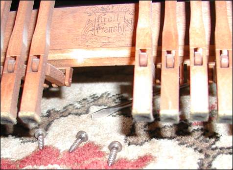 Jesse French piano, sold by Pommer in Sacramento, CA, guaranteed 20 years. Hands are those of Dale Fox, piano tuner and restorer in Sacramento.
