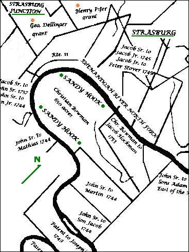 The North Fork of the Shenandoah River, in the present-day Virginia counties of Frederick, Warren and Shenandoah, was mainly settled by German or Swiss-German pioneers. Many settled on fertile farms which had been created by the winding 'Seven Bends' of the Shenandoah River's North Fork.