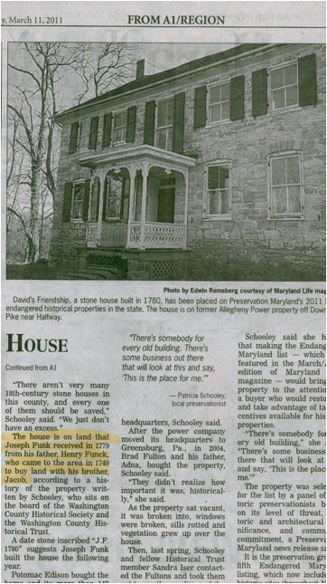 Hagerstown, Maryland, newspaper article on Davids Friendship house named to list of 11 threatened historic properties in state, March 10 and 11, 2011.