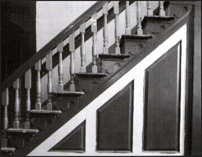 Balusters are turned and quite short, with the balustrade only about 20 inches high. The spandrel beneath the stairs has raised panels. A door to the cellar opens beneath the stairs. Originally there also was a door opposite this one that gave access to the cellar stairs from the southeast room, which was at one time the kitchen.