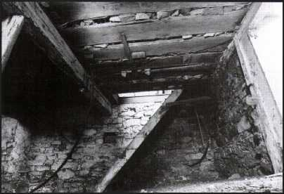 The partial cellar has two entrances: the inner stairs, and a bulkhead at the rear of the building. This entrance itself is probably original but the door once was wider. The ceiling reveals close-set beams, logs that have been flattened on the upper and lower sides, with stones and clay filling the spaces between as insulation. A great, triangular stone mass on the gable end supports the corner fireplaces above it. One side of this mass has a tall, narrow arch and the other a cubby. There are several other cubbies in the cellar walls. The ceiling insulation and the diagonal fireplaces are typical features of 18th century architecture in this area.