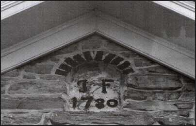 The house faces northwest and has five bays with a central entrance sheltered by a one-story porch. The entrance is broad and has a double door, each with two raised panels. Above is a two-light transom. On this faade, the first-floor openings have segmental arches, and another arch, now filled in, appears at ground level, showing there once was a window into the cellar at that point. The central opening on the second level is a floor-length window that may have been a door at one time. A simple water table defines the foundation on both this faade and the southwest elevation. A date stone in the opposite (northeast) gable is inscribed "J.F. 1780," and all openings on this face, except the two small attic windows, have segmental arches above them.